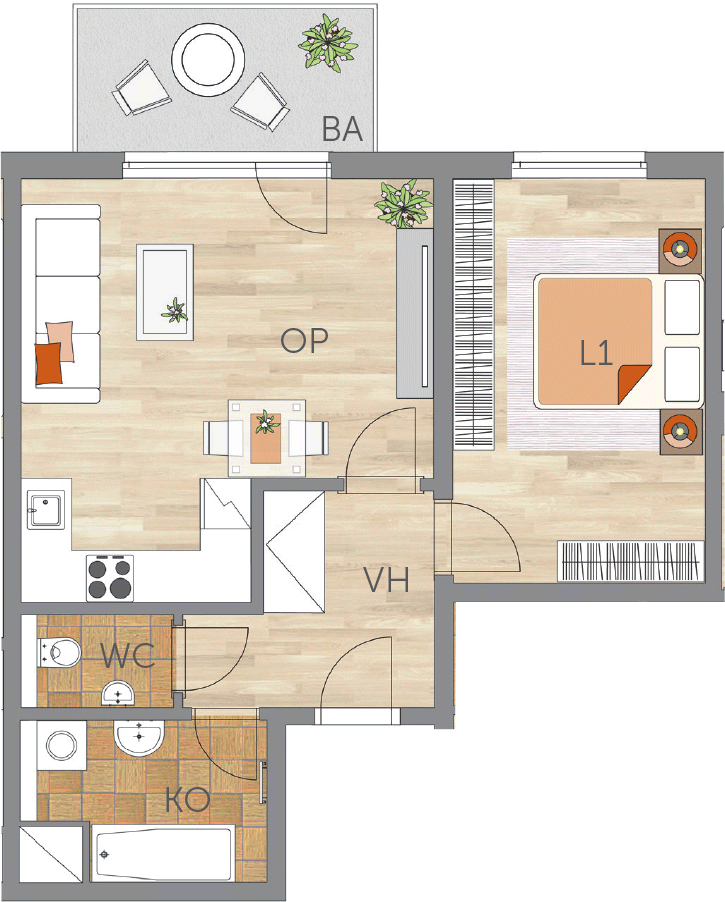 Jižně orientovaný byt s obývacím pokojem s nikou pro umístění kuchyňského koutu, prostornou ložnicí, oddělenou koupelnou a WC a větším balkonem.