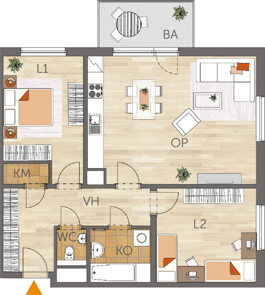 Rohové 3+kk s balkonem, orientované na severozápad. Prostorný obývací pokoj s kuchyňským koutem se vstupem na balkon. Ložnice orientované na jihozápad a na sever. Koupelna s vanou a přívodem na pračku, samostatné WC. Vstupní hala s komorou a prostorem pro vestavěnou skříň.