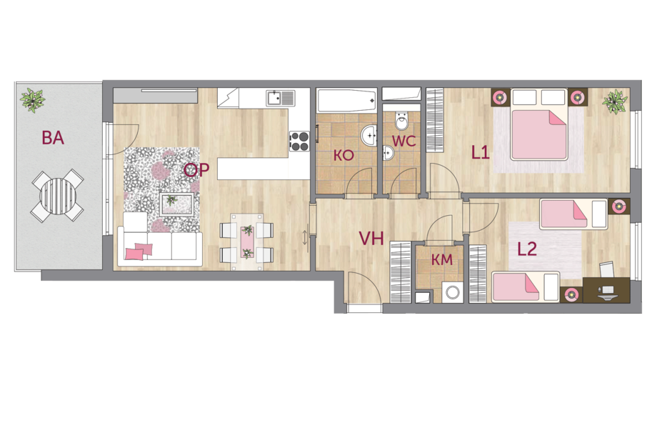 Třípokojový byt s prostorným balkónem nabízí obývací pokoj s kuchyňským koutem s orientací na východ, ložnice s orientací na západ, komoru, koupelnu a samostatné WC, vše přístupné přes prostornou vstupní halu.